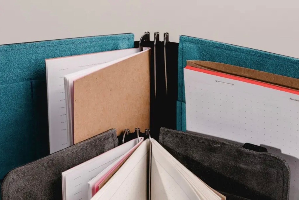 This modular system works like a Traveler’s Notebook in that you can swap in any insert you want. The difference is that the books are held in with clasps rather than elastic, and they can take several books including very chunky ones. They come in A5, A6 and B6. JetPens and Baum-kuchen carry them but if you order directly from their website you can get your cover customized.